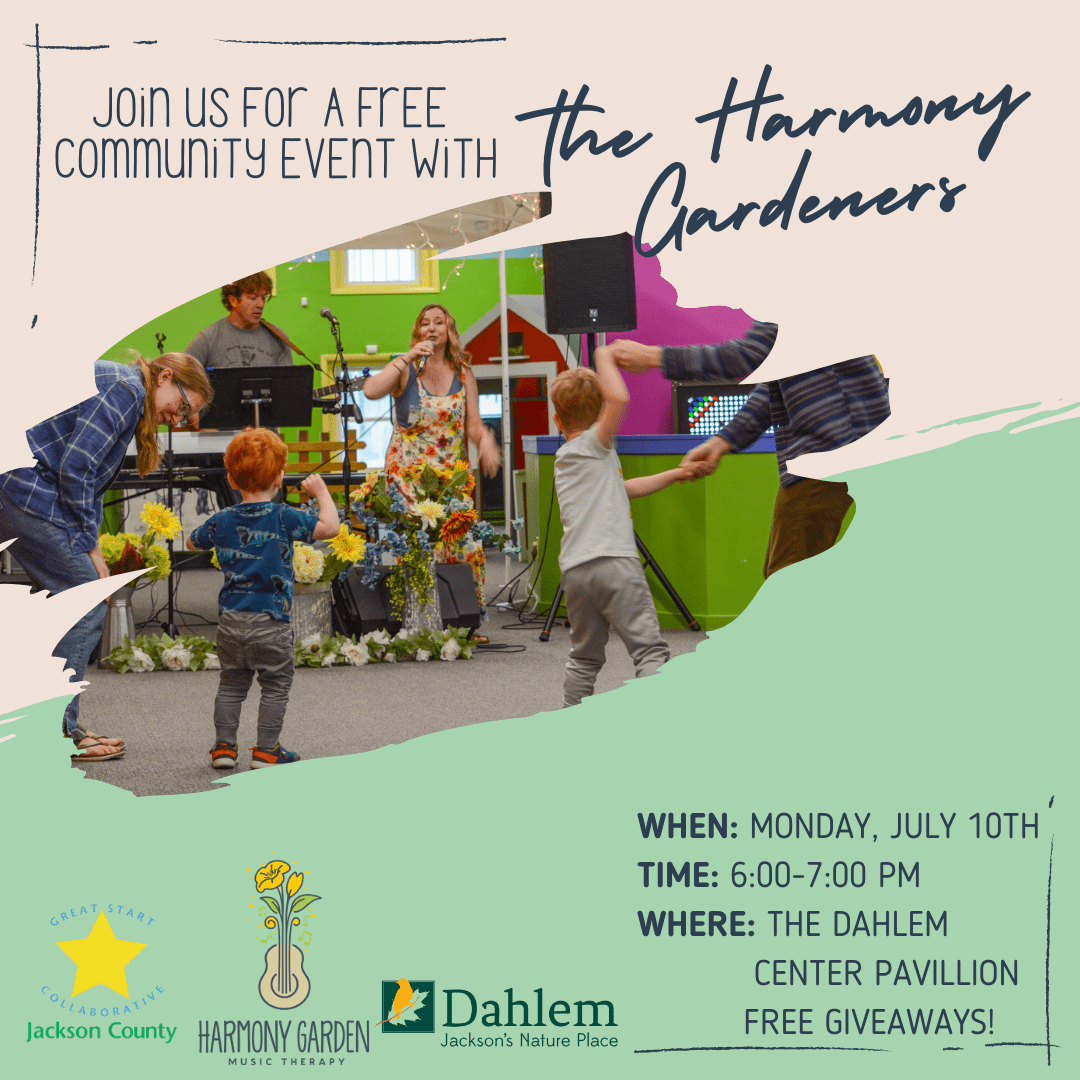 Join us for a fun-filled evening of music at the Dahlem Center! Bring the entire family and your lawn chairs or picnic blanket to enjoy an outdoor concert featuring The Harmony Gardeners. The event is completely free and open to the public, so be sure to invite your friends and neighbors. There will even be free giveaways! This is a wonderful concert for the family!