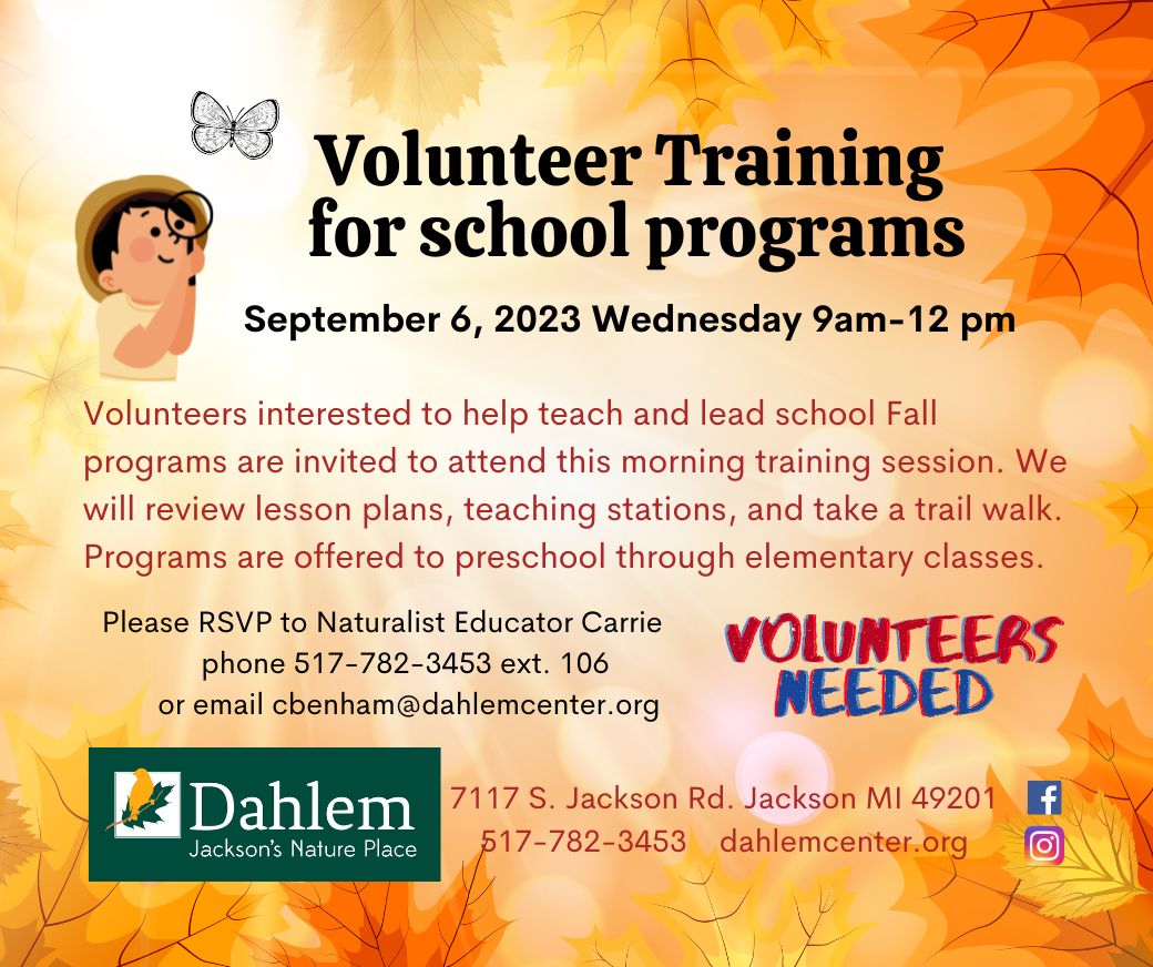 If you’re interested, please RSVP to naturalist educator Carrie Benham to reserve your seat by September 1, 2023 (4:00 pm). Please call 517-782-3453 ext. 106 or email cbenham@dahlemcenter.org. Thank you!